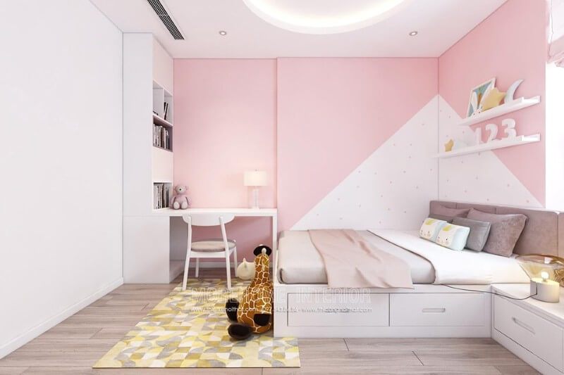 Mẫu thiết kế phòng ngủ bé gái đáng yêu với tông màu hồng chủ đạo kết hợp đồ nội thất nhỏ gọn tiện nghi: tủ quần áo âm tường, kệ sách treo, giường ngủ nhỏ nhắn,.. được nhiều gia chủ yêu thích và hướng đến.