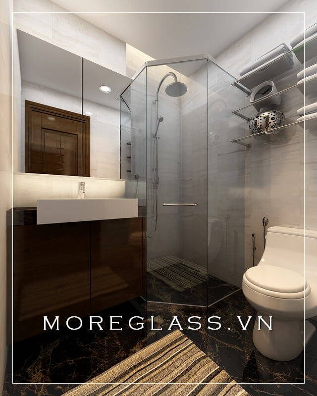 Mẫu thiết kế phòng tắm hiện đại kết hợp vách tắm kính vời kệ tủ độ nhỏ nhắn đang được ưa chuộng hiện nay