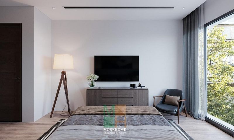 Không gian phòng ngủ với nội thất đơn giản nhưng hiện đại tông màu nhã nhặn trung tính đem tới tổng thể hài hòa.