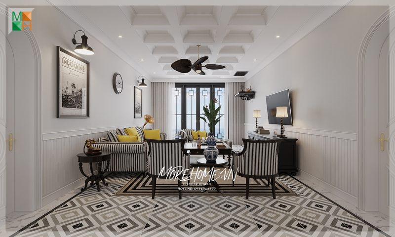 Mẫu thiết kế phòng khách với nội thất gỗ tự nhiên bọc nỉ sọc ltông đen - trắng ấn tượng cho phòng khách chung cư, nhà phố, biệt thự phong cách Indochine