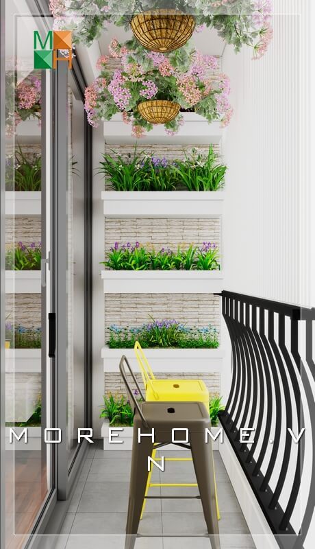 Ghế ngồi ban công và các chậu hoa được trang trí theo một cách độc đáo, tạo nên một không gian xanh mát lý tưởng để thư giãn.