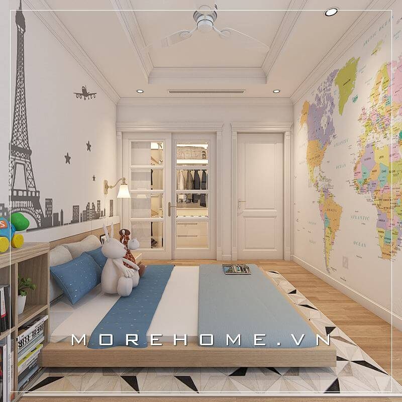 Mẫu phòng ngủ đẹp cho con trai được thiết kế với tone trắng làm chủ đạo, giúp tạo chiều sâu cho không gian, tạo hiệu ứng thị giác khiến căn phòng có vẻ rộng hơn so với diện tích thực