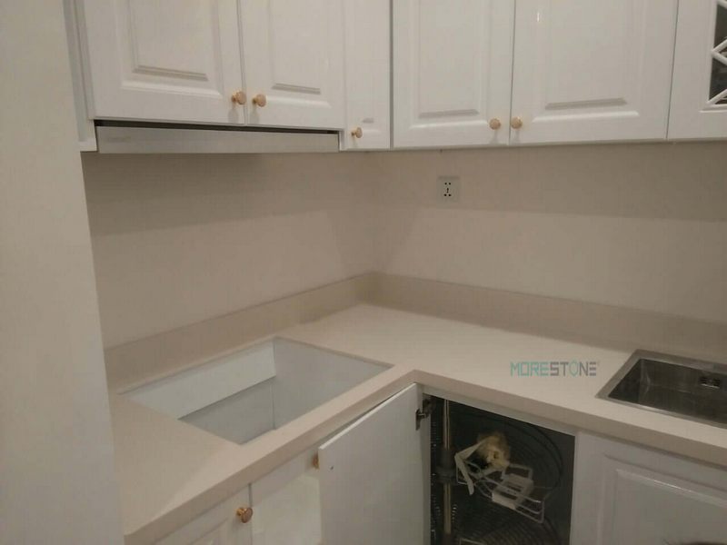 Việc thi công hoàn thiện bếp bằng đá ốp Hàn quốc chất liệu solid surface màu trắng liền khối, không có mạch ghép, sẽ làm cho không gian bếp trở nên sạch sẽ và hiện đại.